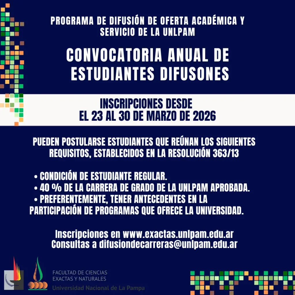 En el marco del Programa de Difusión de Oferta Académica y Servicio de la UNLPam, se informa la apertura de la convocatoria anual de estudiantes difusores.