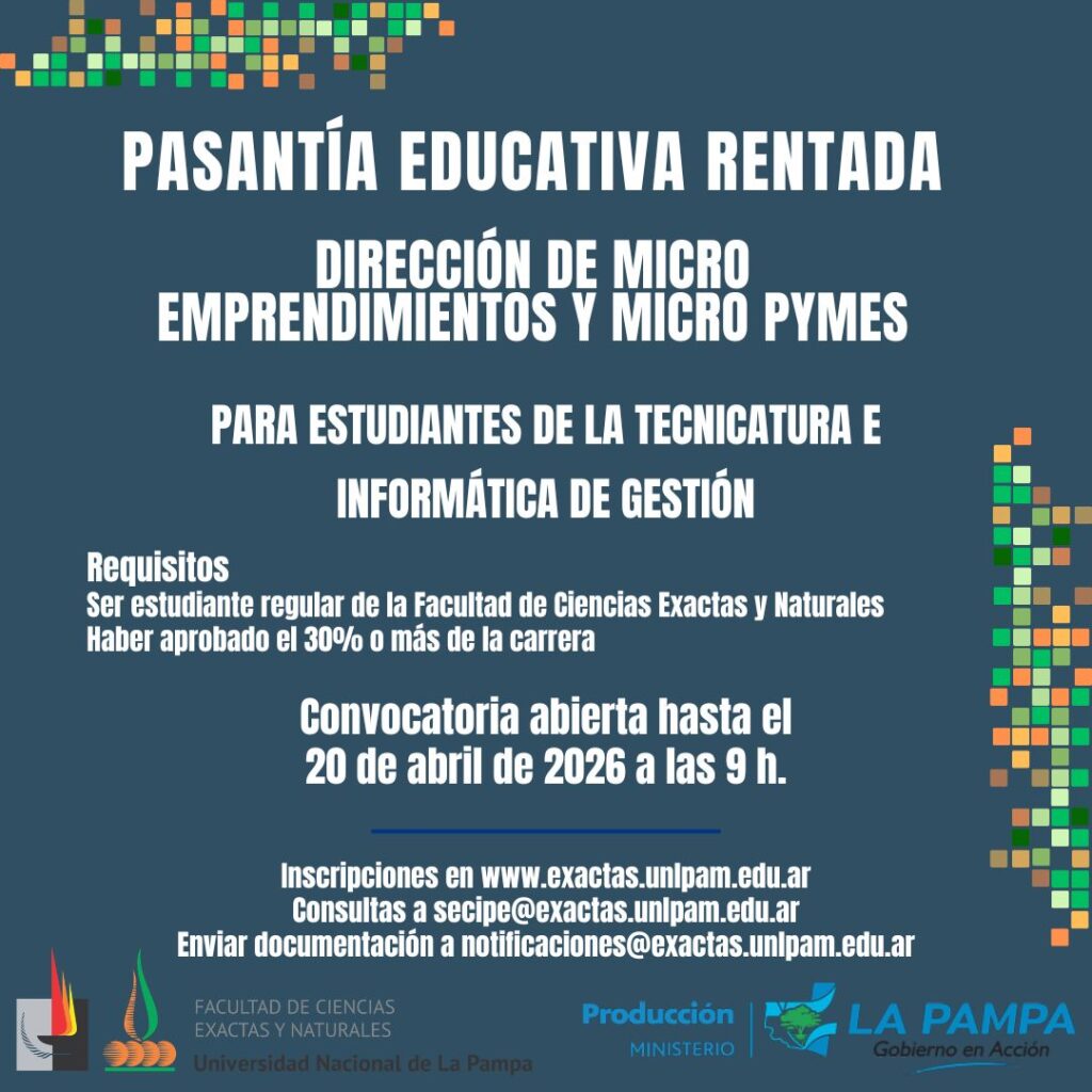 La Facultad de Ciencias Exactas y Naturales, en conjunto con el Ministerio de Producción del Gobierno de La Pampa, anuncia la apertura de una vacante para pasantía educativa rentada.