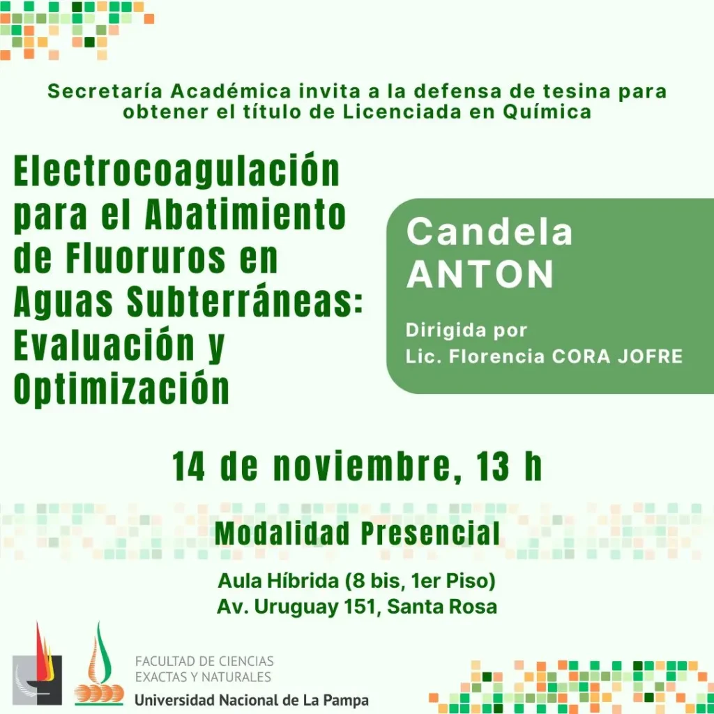 “Electrocoagulación para el abatimiento de fluoruros en aguas subterráneas: evaluación y optimización”, dirigido por la Lic. Florencia Cora Jofre.