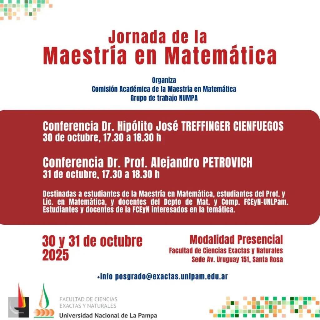Destinadas a estudiantes de la Maestría en Matemática, estudiantes del Profesorado y Licenciatura en Matemática, y docentes del Departamento de Matemática y Computación de la FCEyN-UNLPam.