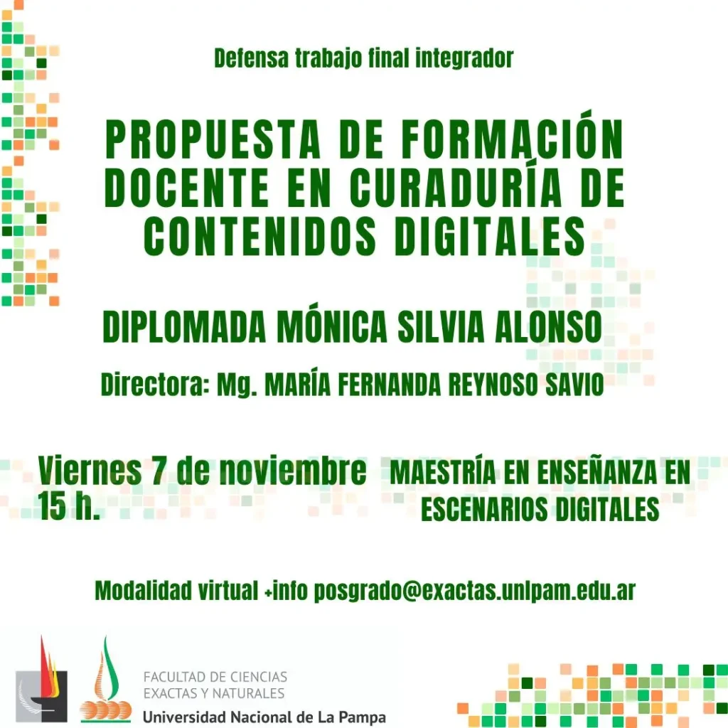 La FCEyN-UNLPam informa que el viernes 7 de noviembre a las 15:00 se realizará en modalidad remota la defensa del TIF de la maestranda Mónica Silvia Alonso para el Magíster en Enseñanza en Escenarios Digitales, titulado “Propuesta de formación docente en curaduría de contenidos digitales”; el enlace debe solicitarse a posgrado@exactas.unlpam.edu.ar. La dirección está a cargo de la Mag. María Fernanda Reynoso Savio y el jurado lo integran el Dr. Guillermo Andrés Oyarzabal (UCA), el Dr. Mariano Ferro (UNLu) y el Mag. Pablo Marcelo García (UNLPam), bajo la organización de la Secretaría de Investigación, Posgrado y Extensión de la FCEyN.
