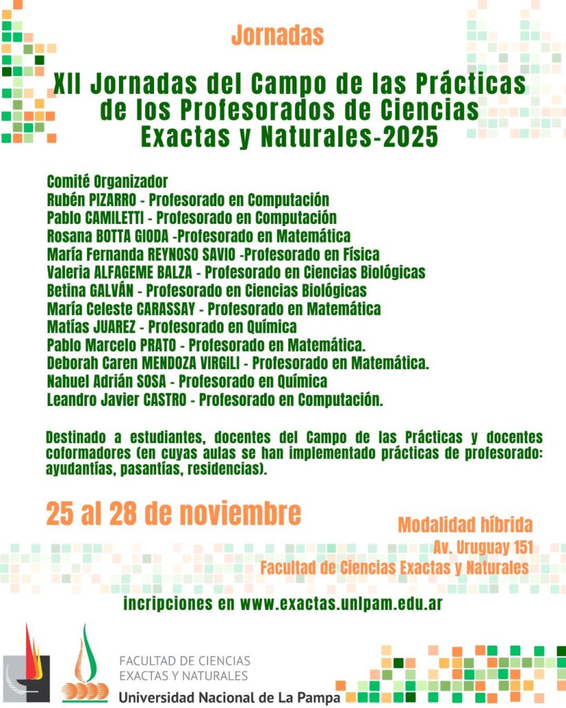 Entre el martes 25 y el viernes 28 se desarrollarán las XII jornadas del Campo de las Prácticas de los Profesorados de la Facultad de Ciencias Exactas y Naturales, una propuesta destinada a estudiantes destinada a estudiantes, docentes del campo de las prácticas y docentes coformadores, en cuyas aulas se han aplicado prácticas de Profesorado como ayudantías, pasantías y/o residencias.